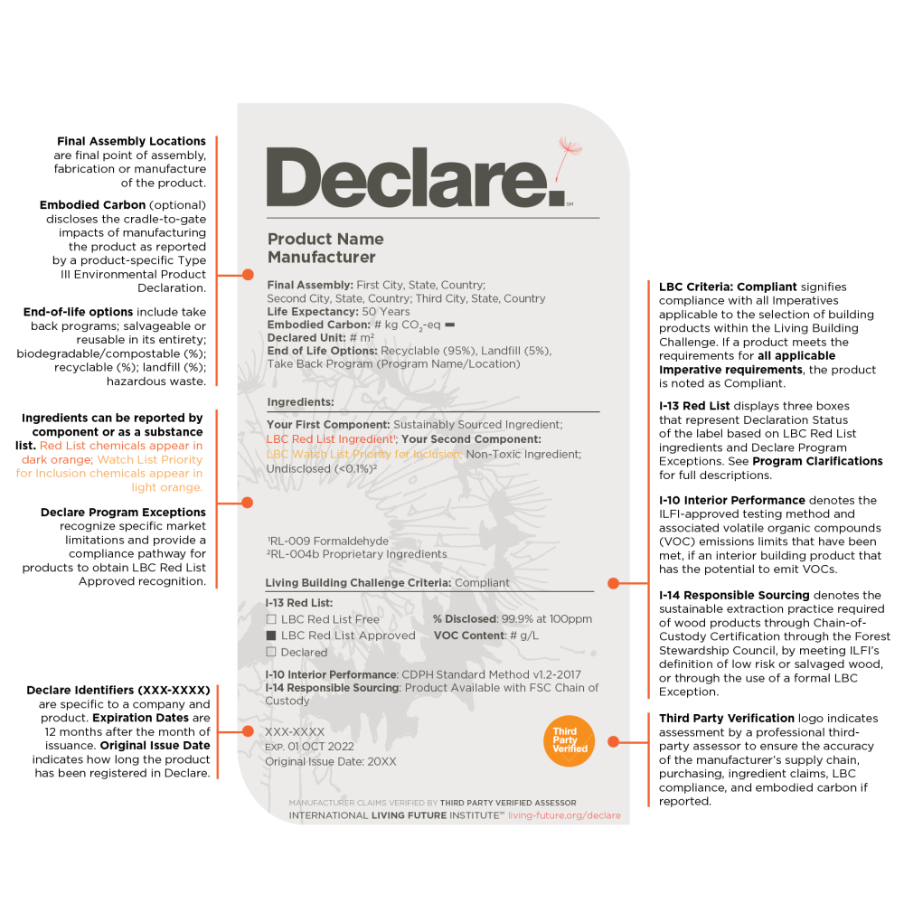 The final portion of the Declare label evaluates and lists the product’s compliance with the product applicable Imperatives within the Living Building Challenge.