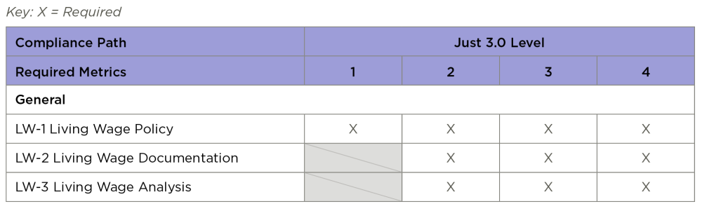 - LW-3 Living Wage Analysis: Spreadsheet of data and calculations documenting the Indicator requirements have been met for all employees for the organization’s specific circumstances.