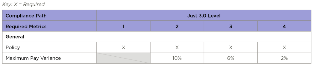 - Organization demonstrates a pay scale with a maximum variance in pay of 2% among racial and ethnic identities within each of the organization’s pay classes.