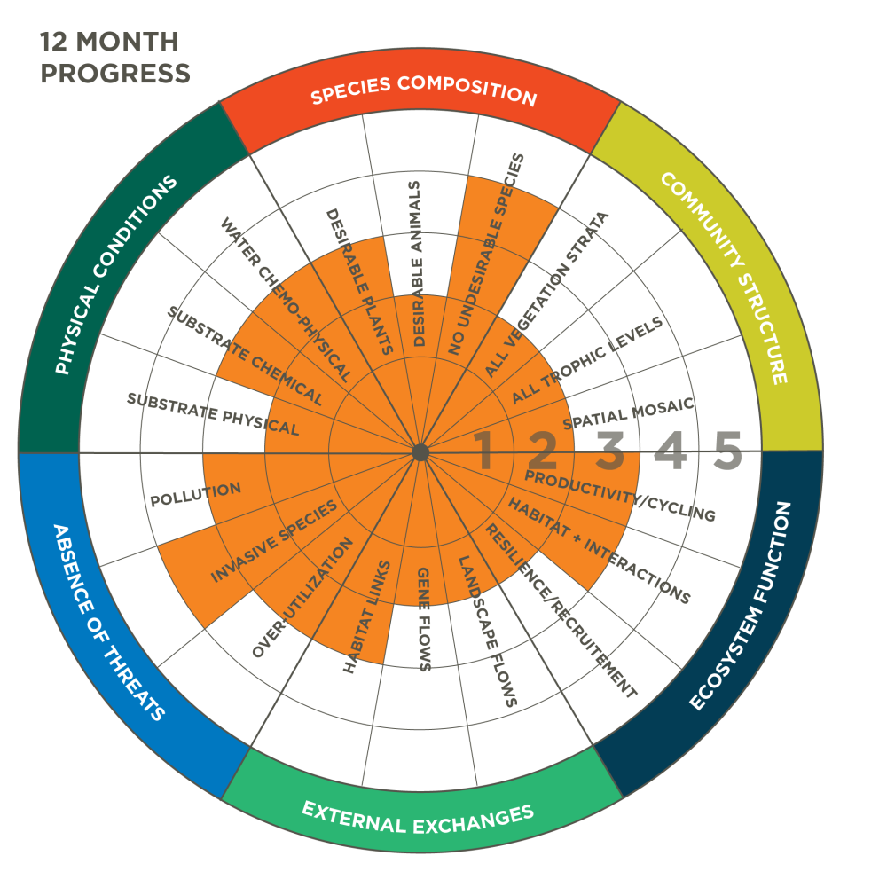 - Install, evaluate, and report on improvements to the project site ecology at the end of the 12-month performance period. Based on what was learned from monitoring, describe progress towards meeting metrics and goals, and identify any corrective measures. Incorporate the Recovery Wheel to show graphically, both baseline pre-project conditions, and ecological improvement (see figure 1-1 Recovery Wheel Template, and figure 1-3 Recovery Wheel Example).