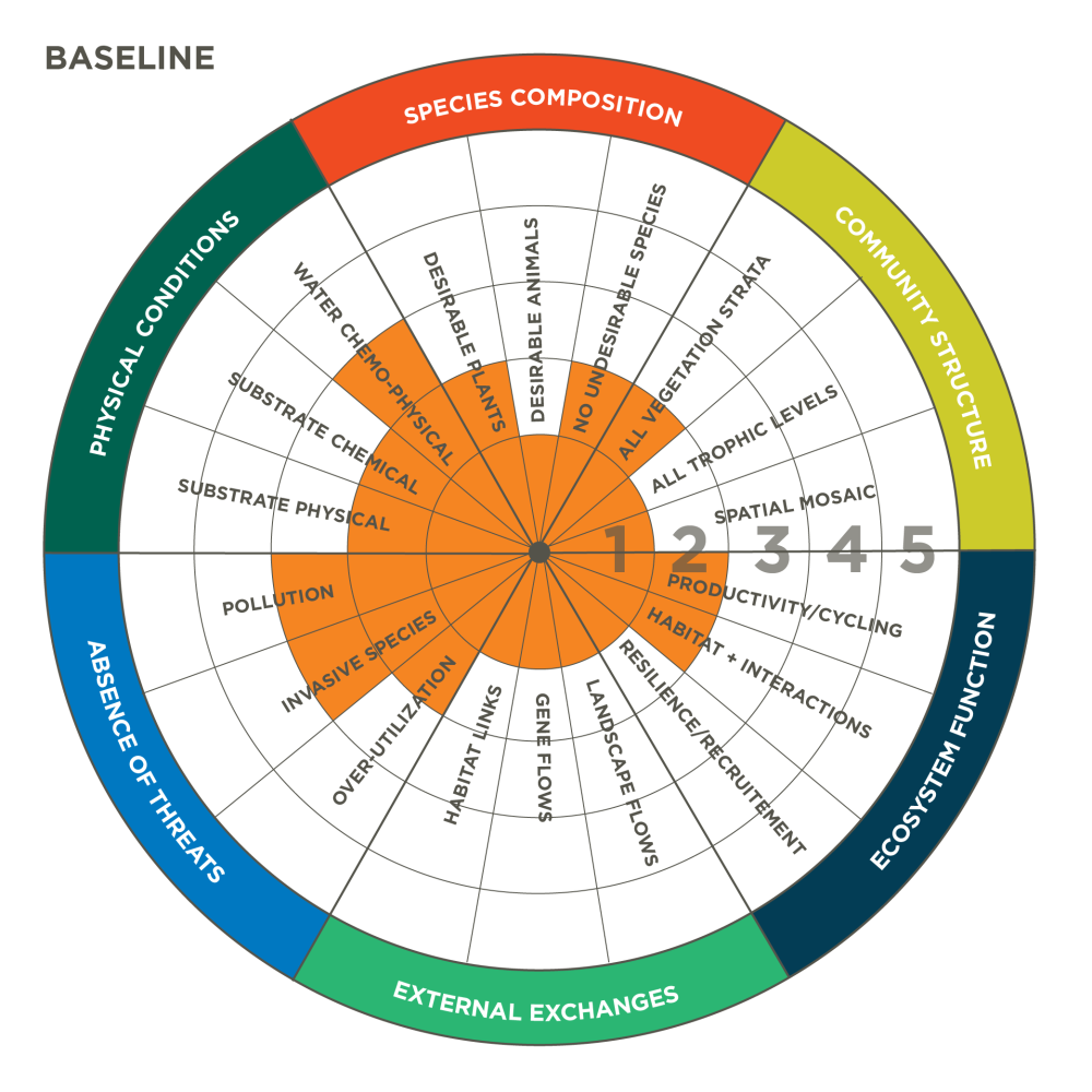 The assessment of the baseline ecological conditions of the site must include an evaluation of existing conditions using the SER Standard’s five-star methodology characterizing six key ecosystem attributes: absence of threats, physical conditions, species composition, structural diversity, ecosystem functionality, and external exchanges (see Table 1-1). The assessment should also identify any special physical features or rare species or communities on the site that need protection. In addition to a narrative description, the baseline conditions should be summarized using the Recovery Wheel, as shown in Figure 1-1, and described later in this clarification.