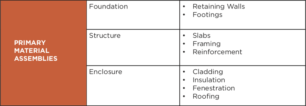 The foundation, structure and enclosure of a building comprise its primary materials; an example scope is shown below in table 7-3. Project teams should identify an equivalent list of materials that is applicable to their project.