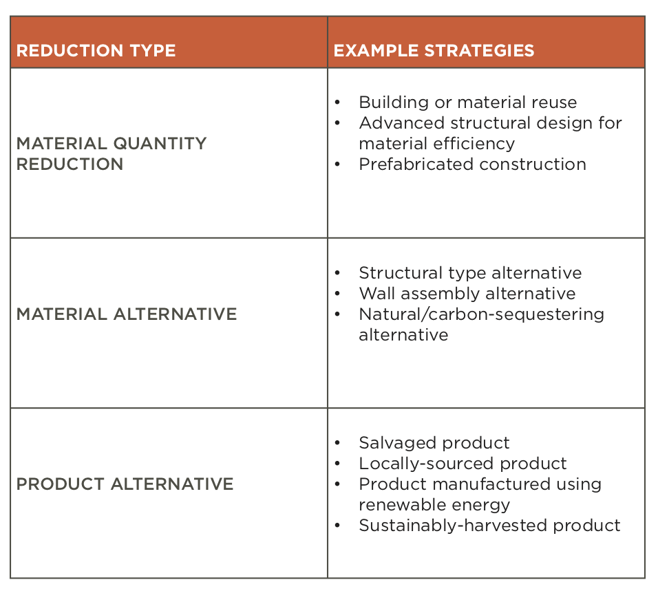 Eligible embodied carbon strategies can be classified into one of three categories: a material quantity reduction, a material alternative, or a product alternative. Example strategies to reduce embodied carbon within these categories may include, but are not limited to, those listed in Table 7-4 below: