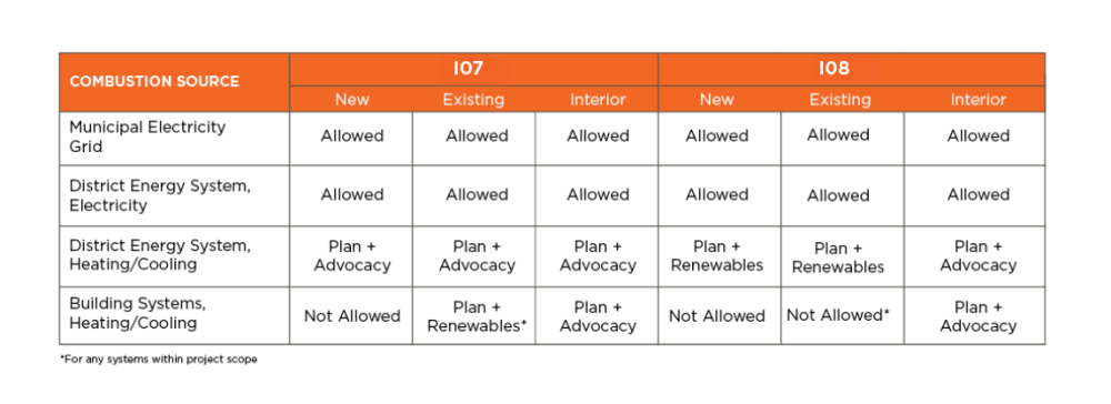 Where combustion is permitted, the energy consumed must be metered, included in the Energy Production and Demand Table, and documented as part of the total energy used and, if pursuing I08 Net Positive Carbon, offset by installed or procured renewable energy. For Interior projects pursuing I-07 only, if shared base building HVAC energy is not part of the target EUI due to being out of scope, then that energy consumption does not need to be metered, documented, or offset, even if from combustion-based sources. For projects pursuing I-08, regardless of the approach used for the target EUI, a proportionate share of base building systems must be offset with renewables (see I-08 Clarification Interior Shared Systems Offset). See the Clarifications for that Imperative.