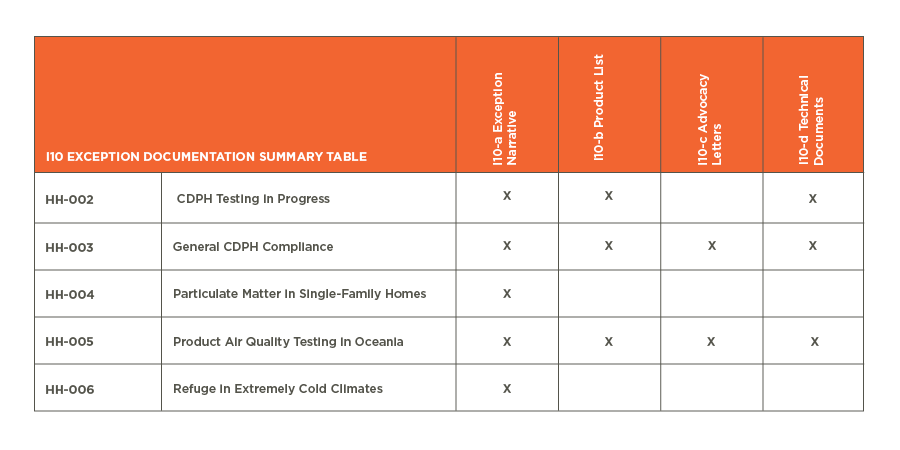 Projects that use Exceptions or compliance paths that are not standard for all projects must submit additional documentation per the below. Unless the exception is tied to the 12-month performance period, all exception documentation must be submitted at the Ready Audit.
