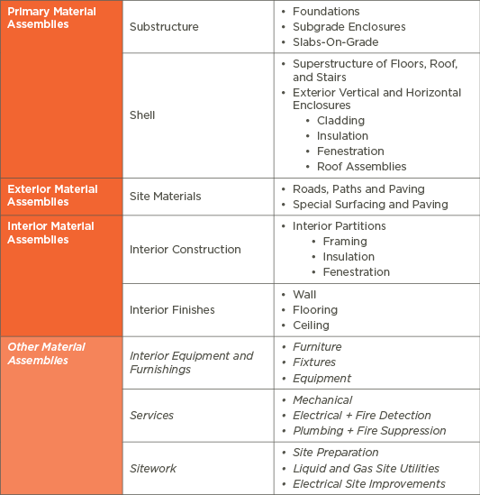 Approved carbon offsets must be procured to cover the total embodied carbon of the project, including impacts from construction and from new or refurbished materials. When calculating the project’s embodied carbon, project teams must include the upfront embodied carbon of their primary material assemblies, interior material assemblies, and exterior material assemblies as shown in Table 8-1. The embodied carbon values may be calculated individually or exported as a subset from the project’s LCA calculations.