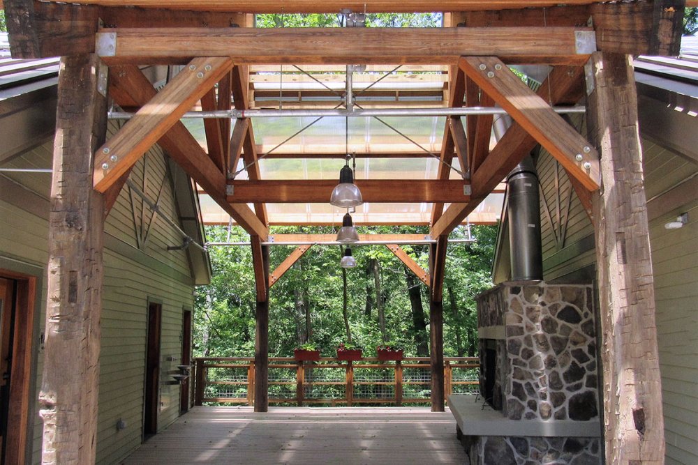 The Living Learning Center (LLC) is located in the Tyson Research Center, a 2,000-acre forested property that also contains an environmental field station for Washington University in St. Louis, Missouri. In keeping with the LLC’s broader research and teaching mission of ecological sustainability, the project team decided to sustainably harvest lumber from within the Tyson property itself. The oak, walnut, and ash used on the project came from storm-downed or dead trees harvested near roads to minimize disturbance to the ecosystem. Both the eastern red cedar used for the siding and the hard maple laid for the flooring are able to grow in shallow soils only when fire has been suppressed, as it has been for decades at the Tyson Research Center. These species are therefore considered invasive, and were already slated for removal as part of a restoration plan to improve the ecology of the property. This harvesting strategy, which aligns well with the regenerative principles of the Living Building Challenge, prompted the LBC team to create an Exception (Exception MT-002, Invasive Species) allowing the intentional on-site harvest of invasive trees in order to restore damaged ecosystems.