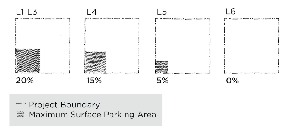 The total area of impervious surface parking allowed is dependent upon a project’s Transect and Project Boundary (see figure 4-1). If project parking needs exceed the allowable surface cover, the additional parking must be structured or underground.