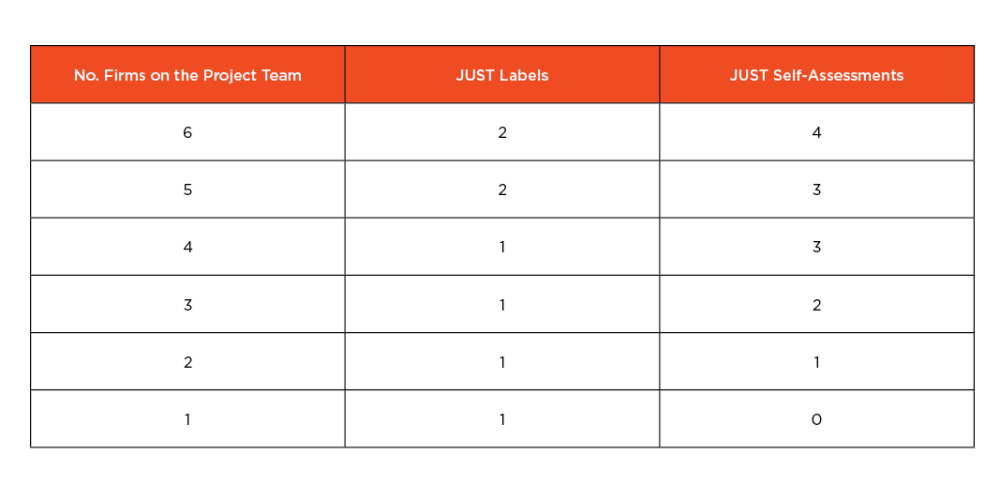 If a project team has more than two Just-labeled organizations that play an integral role on the project, the additional labels may count towards the self-assessment requirement. In other words, a minimum of seven organizations must engage with the Just program, with two or more organizations having a Just label and the rest completing the self-assessment.
