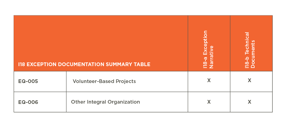 Projects that use Exceptions or compliance paths that are not standard for all projects must submit additional documentation per the below. Unless the exception is tied to the 12-month performance period, all exception documentation must be submitted at the Ready Audit.