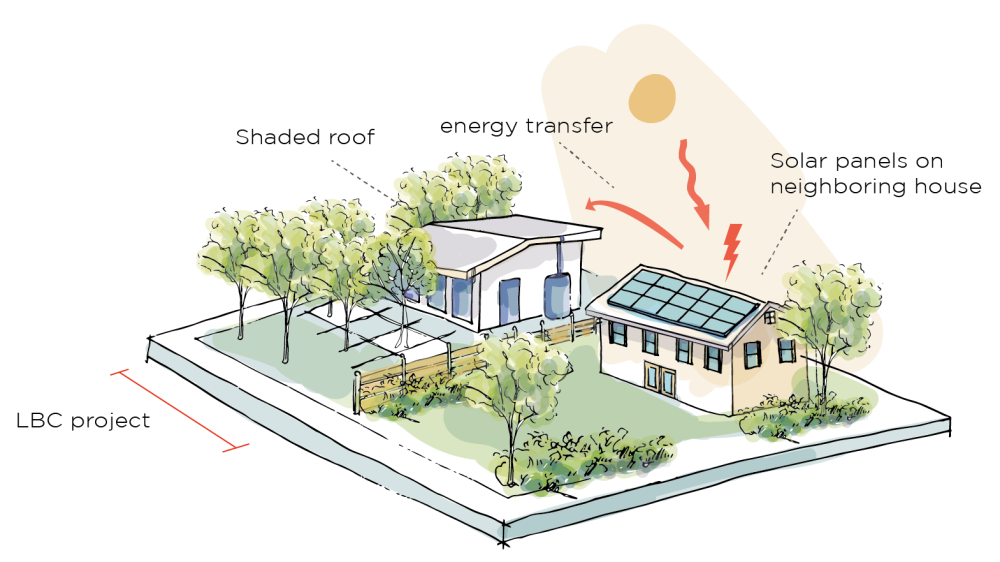 Protecting solar potential means not preventing the other projects involved in the Scale Jumping from meeting the requirements of Zero Energy Certification. It is acceptable to place PV panels on the rooftops or other areas of neighborhood properties and use the energy generated from these adjacent off-site sources to power the project if those other properties could also meet the requirements of Zero Energy Certification or the project is sufficiently efficient.