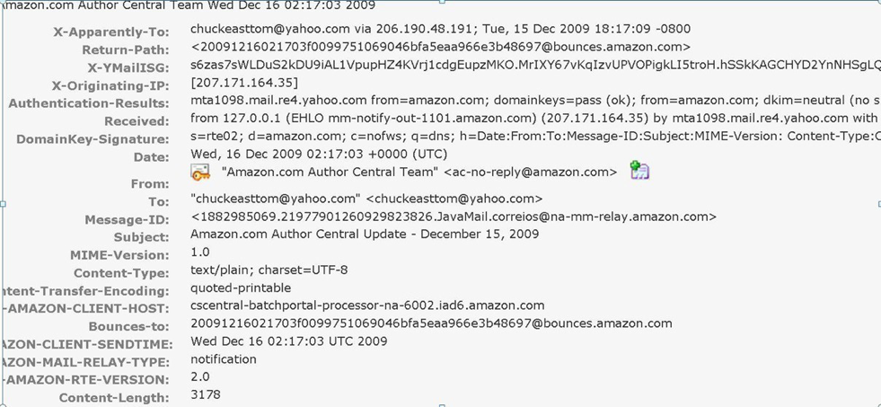 Emails have what are known as email headers. These headers of an email message provide a great deal of information to you as a forensic investigator. The standard for email format including the header is RFC 2822. IT is important that all email uses the same format. That is why you can send an email from outlook on a Windows 8 PC and the recipient can read it from a Hotmail account on an Android phone that runs Linux. This is because all email programs use the same email format, regardless of what operating system they run on.