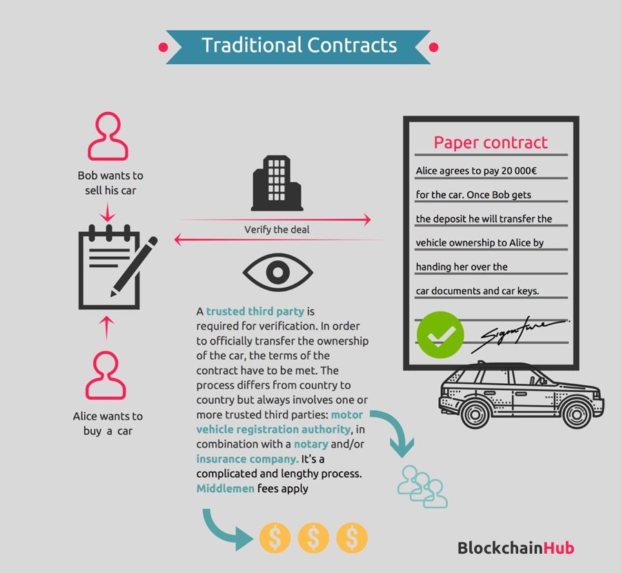 If A and B don’t know and don’t trust each other, they usually need a trusted third party to serve as an intermediary to verify transactions and enforce them. With smart contracts & blockchains, you don’t need those trusted intermediaries anymore to clear or settle your transactions. Take the example of buying and selling a car: