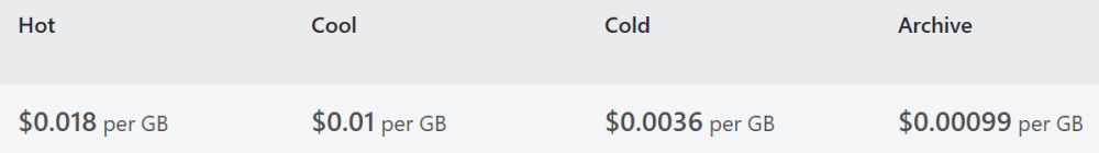 | Archive | 12 * $0.00099 * 1000 = $12 The archive tier must be managed when a Restore is needed. While a blob is in the Archive access tier, it’s considered to be offline, and can’t be read or modified. In order to read or modify data in an archived blob, you must first rehydrate the blob to an online tier. This can be done form Microsoft Storage Explorer and other tools. |