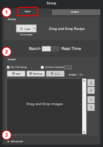 The Input panel controls what images will be processed, what recipe will be used to process them, and how they will be handled.
