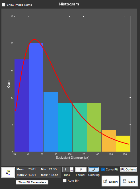 - Curve Fit: Add Normal, Lognormal, or Bimodal distribution fits. See Curve Fitting for detailed information. Fit parameters are automatically extracted and can be included in reports.