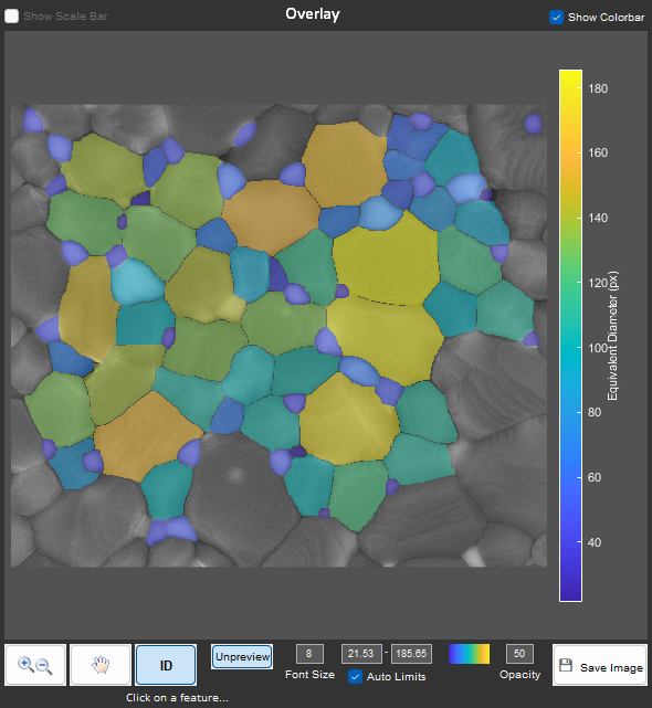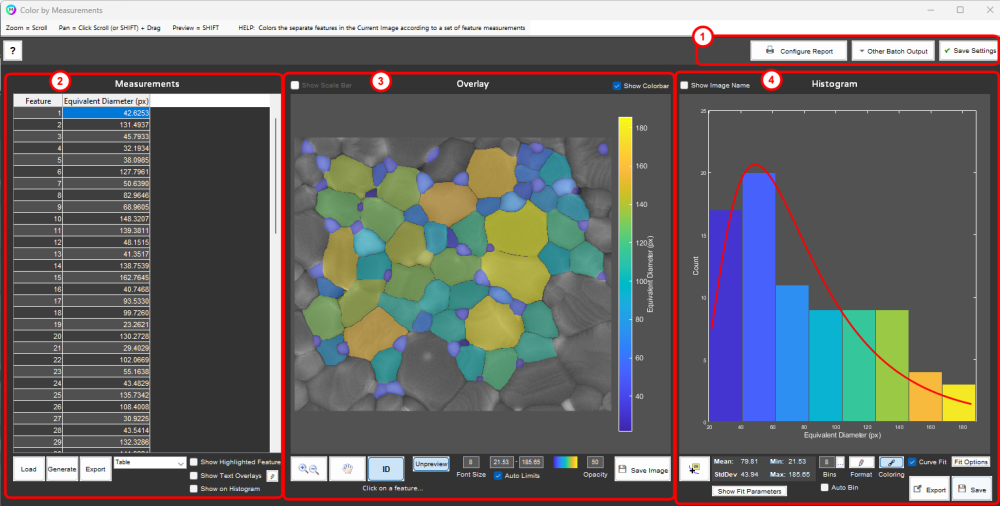 Colors the separate features in the Current Image according to a set of feature measurements. The interface separates the measurement table, overlay visualization, and histogram into distinct panels with settings that can be saved and automatically applied during batch processing.