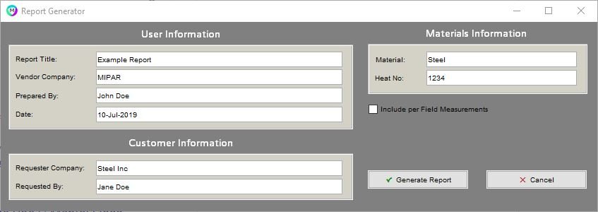 Below is a screenshot of the Report Generator interface. The information entered into the fields will be entered into the header of the report.