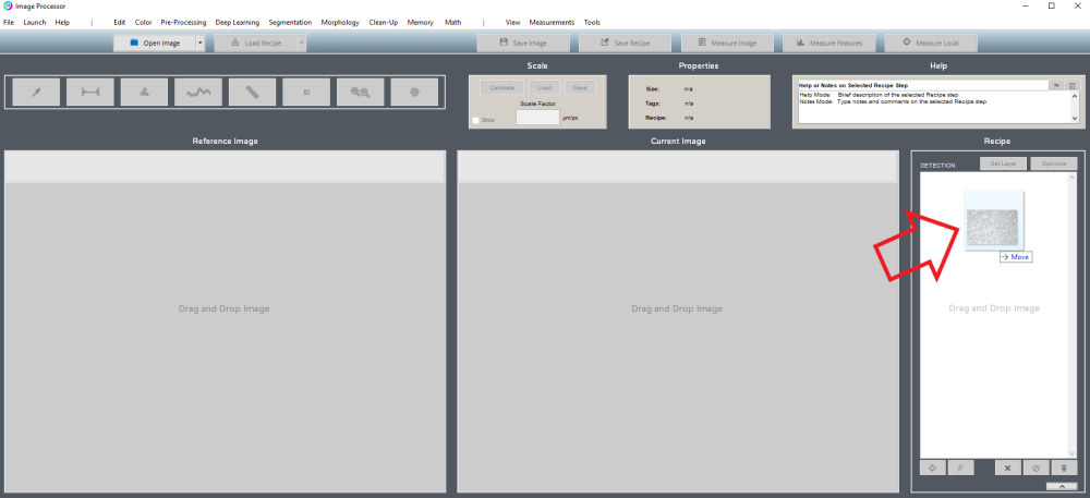 Drag and drop your first image to open. Drag and drop “trace-grains.rcp” to load.