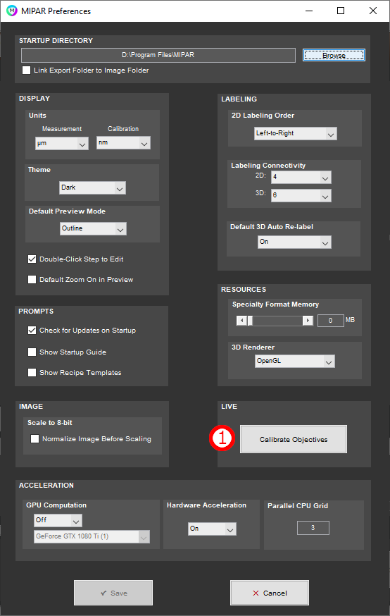 The Camera Setup window is accessed from the Preferences window, using the (1) Calibrate Objectives button.