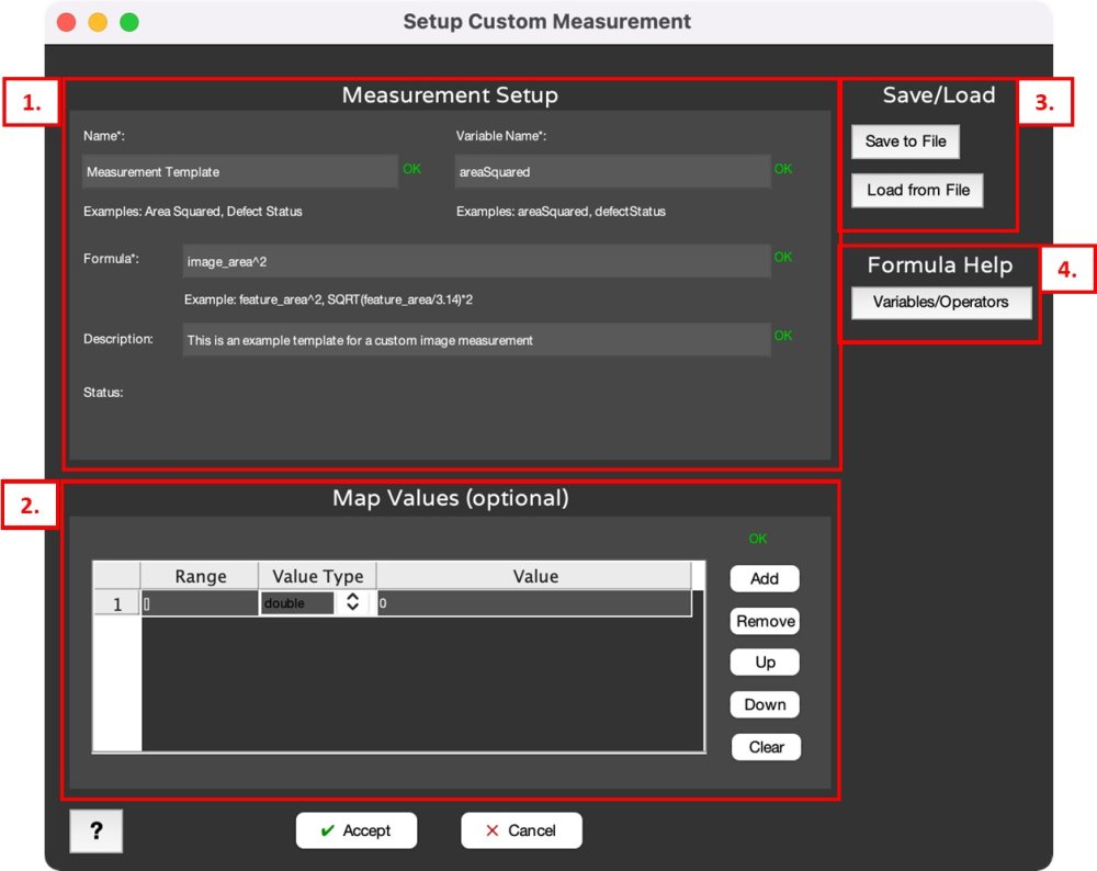- Variables/Operators: assistant dialog for formula building that lists all valid operators, built in and custom measurement variables and their syntax.