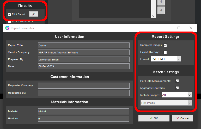 7. Set the Report Settings -> Format to “PDF”, select Batch Settings -> Per Field Measurements and Batch Settings -> Aggregate Statistics, set Batch Settings -> Include Images to “All”