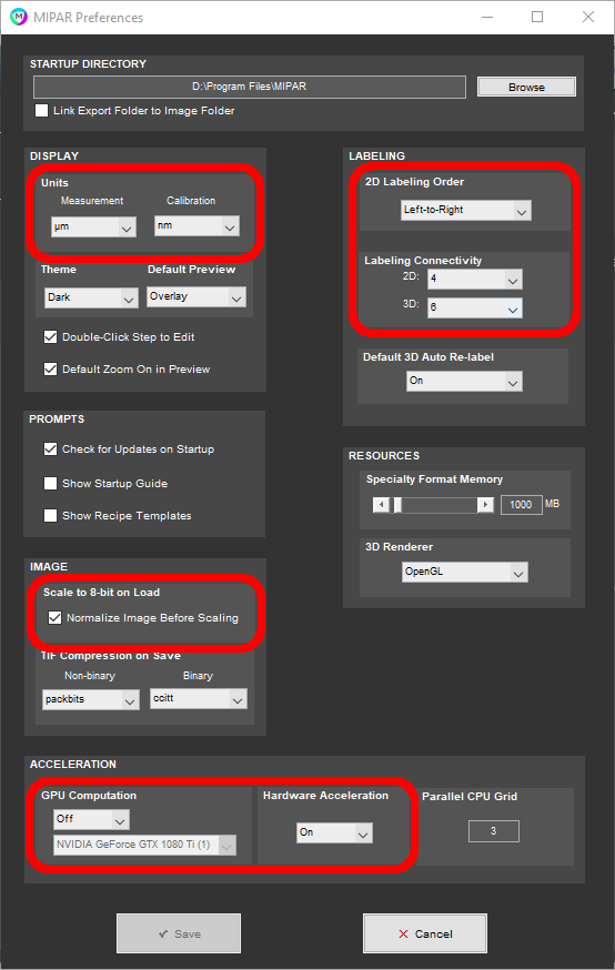 2. Record any Preferences that may impact analysis: Measurement and calibration units, Image -> Scale to 8-bit on Load (if the input images are not 8-bit), Labeling -> 2D Labeling Order, Labeling -> Labeling Connectivity, GPU Computation, and Hardware Acceleration