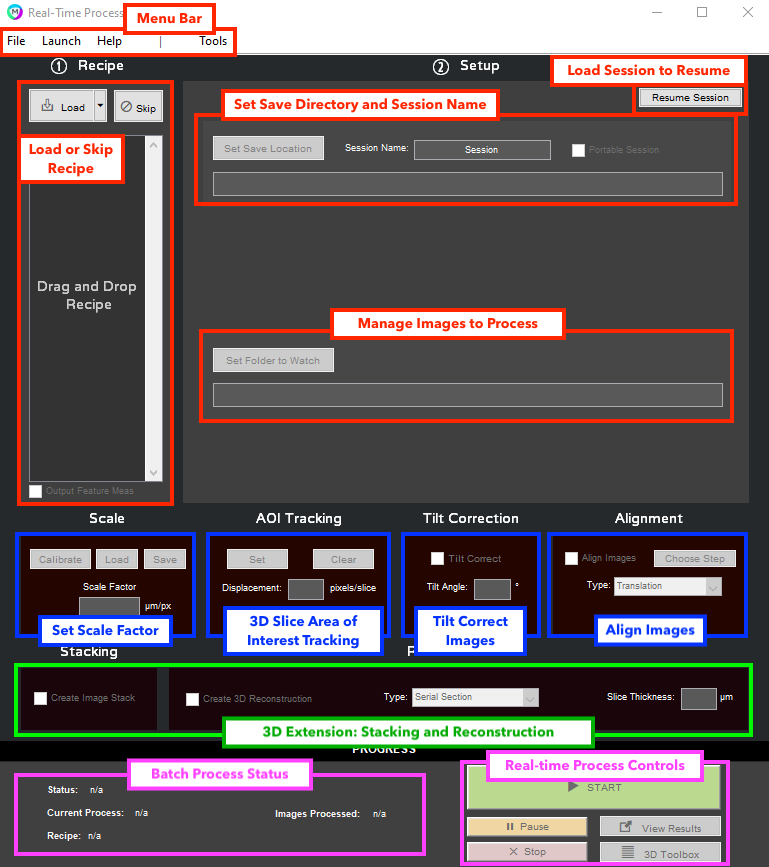 Below is labeled screenshot of the Real-Time Processor which reveals the layout of and purpose behind each user interface element.