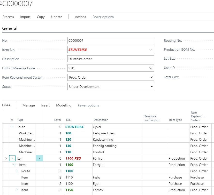 - Green = This line colour is used on items and means that the item exists in BC and itself is a production BOM in BC