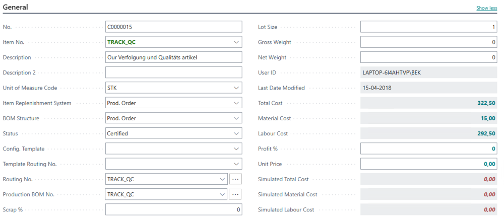 - Lot Size = Value to be used in calculation, if it has been chosen in Setup to calculate incl. Setup costs.The value will be transferred to the main Item when this is created.
