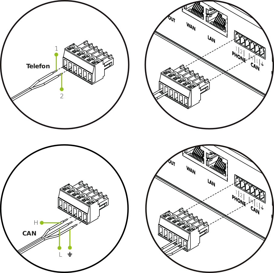 5. Verdrahten Sie die Klemmleiste mit der Telefonleitung bzw. den CAN-Leitungen.