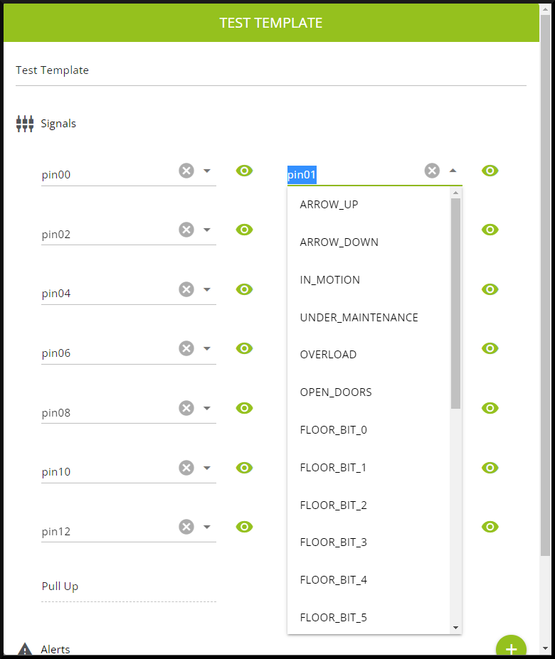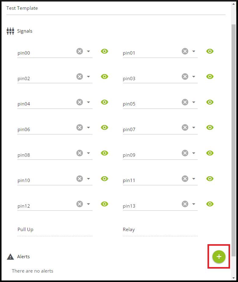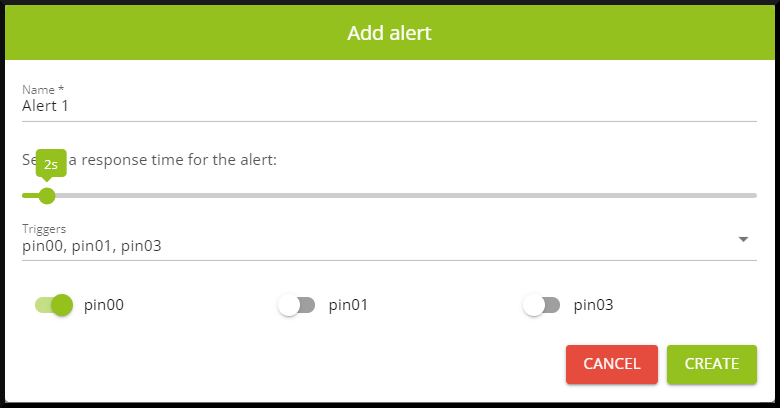 8. . Assign a custom name, time (optional) and pins indicating their state. In this example, an alert called “Alert 1” will be generated after the acquision card detects that “pin00” is HIGH while “pin01” and “pin03” are LOW for over 2s.