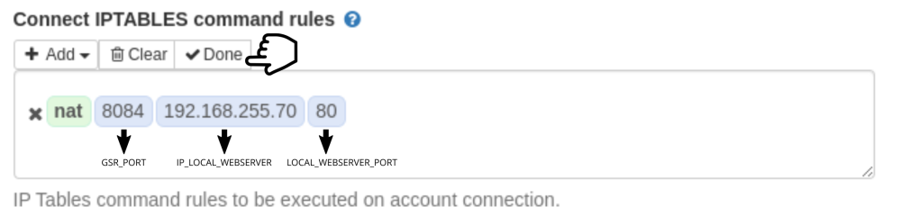 nat<GSR_PORT> <IP_LOCAL_WEBSERVER> <LOCAL_WEBSERVER_PORT>