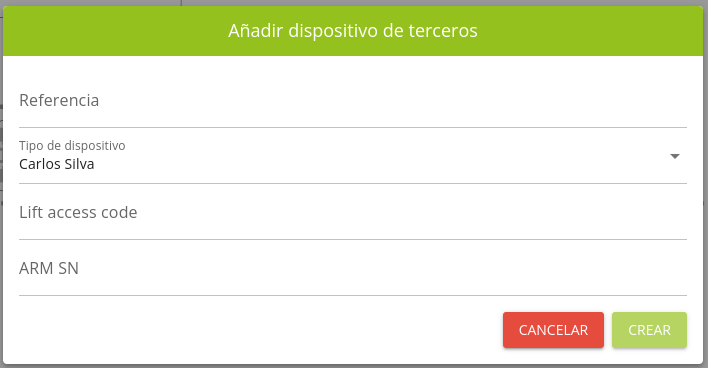 Escribir la Referencia y seleccionar Carlos Silva en Tipo de dispositivo . A continuación, escribir el Lift access code y el ARM SN