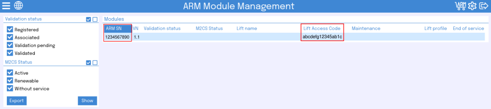 Para conocer el Lift access code y el ARM SN, acceder a la página siguiente: https://www.m2cs-arm.com/CarlosSilvaWEB/index.jsp