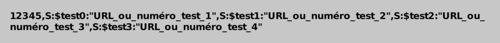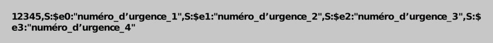 12345,S:$sos0:“numéro_sos_1”,S:$sos1:“numéro_sos_2”