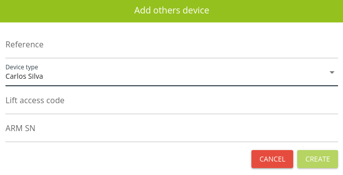 3. Écrivez la Reference et sélectionnez Carlos Silva dans Type. Écrivez le Lift acces code et le ARM SN.