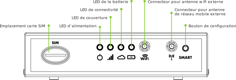 La LED cloud() indique l’état de connexion du GSR aux services NAYAR via le réseau VPN NAYAR. Une led clignotante indique la transmission de données à travers le VPN.