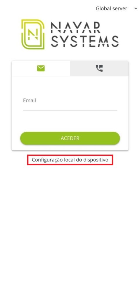 - Configuração local do dispositivo / Modo off-line: Este modo permite fazer alterações à configuração do dispositivo quando este não tem acesso à Internet. Para a utilizar, é necessário descarregar a aplicação da Nayar Systems. Ligações para descarregar: Android / iOS. Quando a aplicação estiver aberta, clicar em “Configuração local do dispositivo” e seguir os passos descritos no assistente.