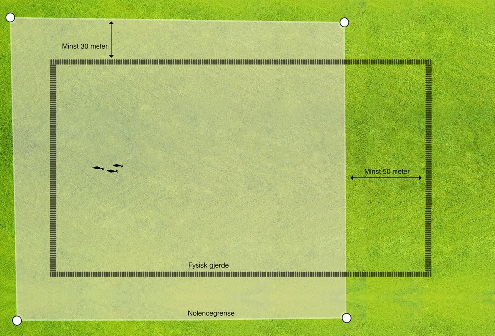 Innlæringen foregår innenfor et fysisk inngjerdet område. I figuren under er det fysiske gjerdet vist med svarte gjerdestolper, mens Nofencegrensa illustreres med hvit linje mellom hvite hjørnestolper.