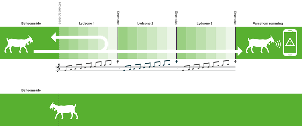 Illustrasjonen viser ønsket adferd. Dyret går ut av beiteområdet, responderer på lyden, snur, og går tilbake til beiteområdet.
