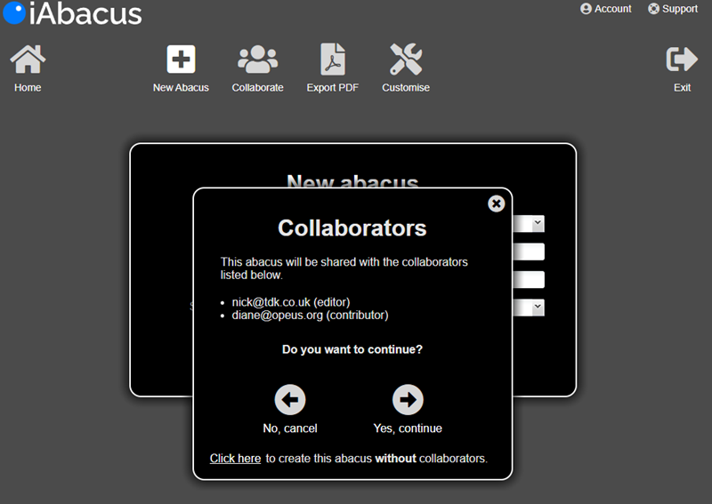 When staff then select the template from the create abacus list they will be advised that it will be shared and will list the collaborators.