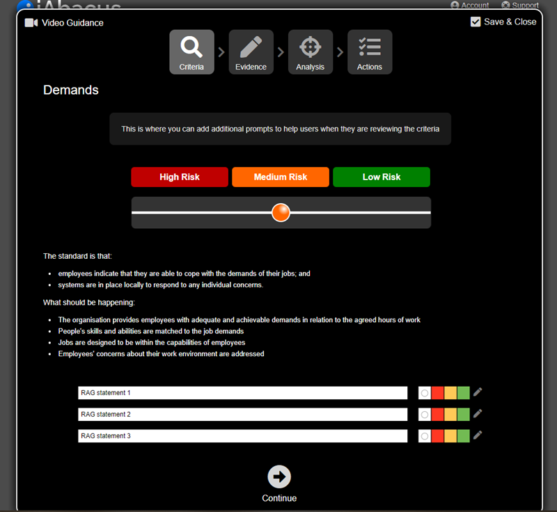 You have the option of adding statements to the Review Criteria screen that users can then rate Red, Amber, or Green (RAG).