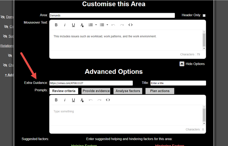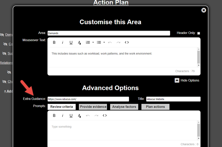 Click on the area for which you want to add a web link. In the pop up box click show options – you will see a section titled Extra Guidance. Type the web address in the box to the right (ensure you include the https:// for the link to work). You can also include a name for the web page in the box to the right.