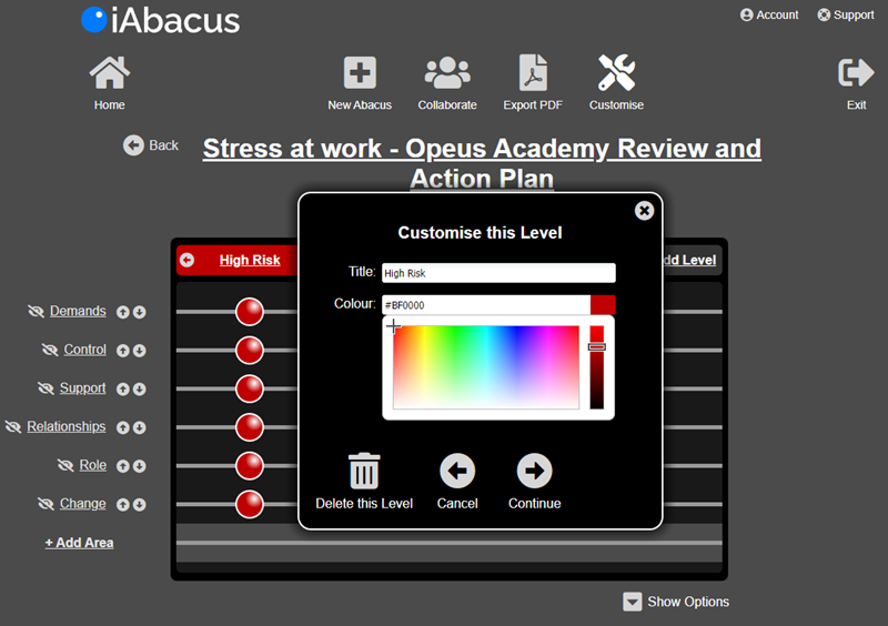 To change the text and colour of the levels across the top of your abacus, first click on the Customise button at the top of the screen.