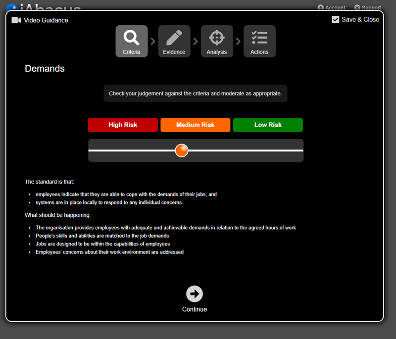 Once you are done, either click Save and Close in the top right corner, or click Continue to go to the Provide Evidence screen. You can always come back later and amend what you have done.
