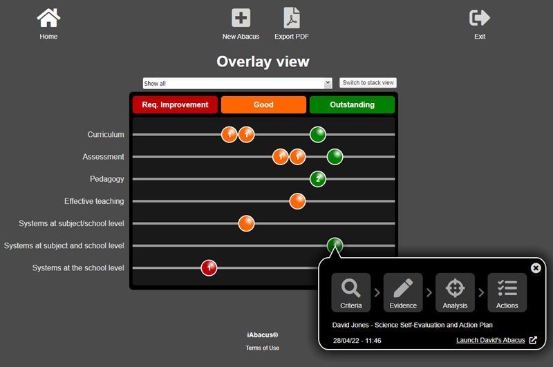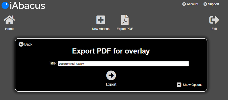 To overlay abacuses, go to the Home screen. Tick the box to the right of the abacuses you wish to overlay, or click Select All. Click on the Choose an Option drop down menu and select Overlay to compare.