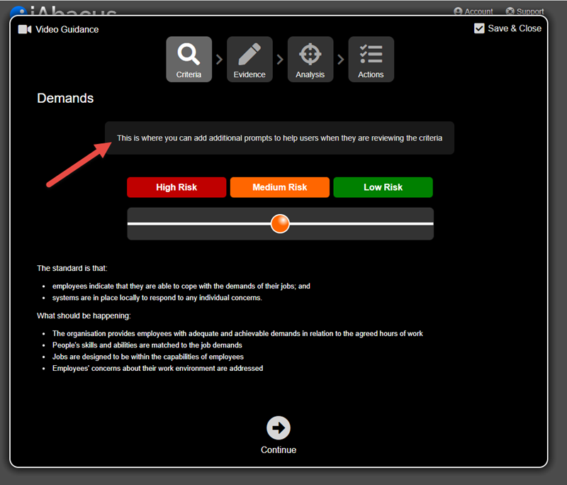 You have the option of adding prompts and written guidance for each of the steps: Review Criteria, Provide Evidence, Analyse Factors, Action Plan.