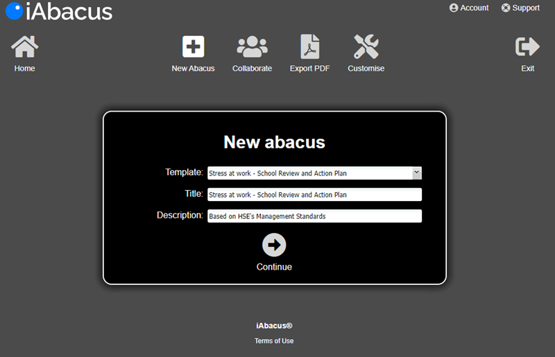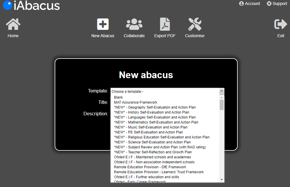 To begin, click on the New Abacus button at the top of your home screen. The first drop down menu you see is Template. Click the choose a template drop down and a list of templates will appear.