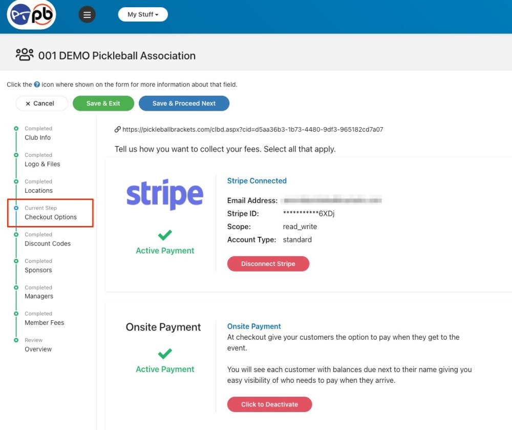 The organization or club must setup Stripe to accept online registration fees and payment for other tournament items. Once done, the tournament director or manager will be able to specify that as the tournament Checkout Option.